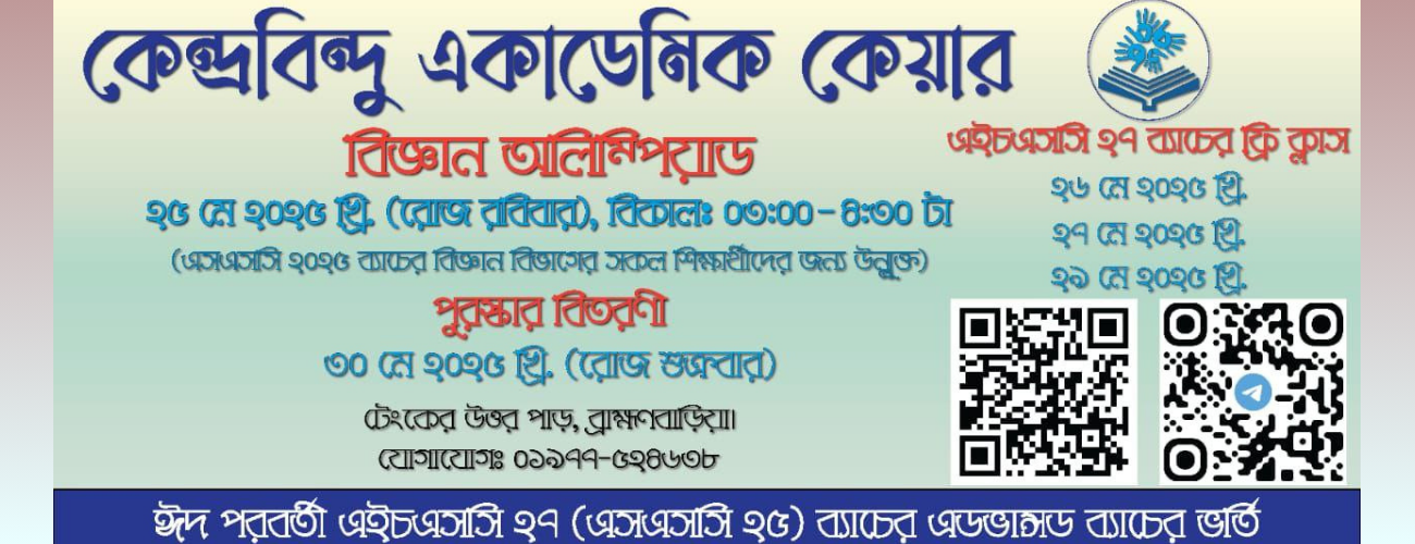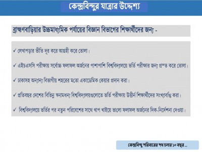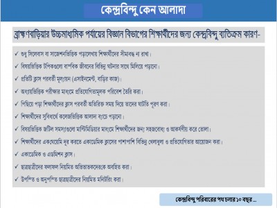 ২০১৪ সালের ২৬ শে জুন কিছু স্বপ্নবাজ তরুণদের নতুন কিছু করার বাস্তব প্রতিচ্ছবি আমাদের এই কেন্দ্রবিন্দু। আমাদের এই প্রিয় কেন্দ্রবিন্দু আজ তার যাত্রাপথে দশম বছর শেষে একাদশ বছরে পদার্পণ করেছে। একটি ক্লাসরুমে তিন জন শিক্ষার্থী নিয়ে শুরু হয় আমাদের কেন্দ্রবিন্দু পরিবারের পথ চলা। একটা ক্লাসরুম আর ৩ জন শিক্ষার্থী থেকে আজকে ১০ বছর পূর্তিতে কেন্দ্রবিন্দু পরিবারের সদস্য সংখ্যা ১০ হাজার ছাড়িয়েছে, যাদের মধ্যে অধিকাংশই দেশের বিভিন্ন স্বনামধন্য বিশ্ববিদ্যালয়ে অধ্যায়নরত আছে,এমনকি কেন্দ্রবিন্দু পরিবারের ছাত্রছাত্রীরা এখন দেশের গণ্ডি পেরিয়ে বিদেশের বিভিন্ন স্বনামধন্য বিশ্ববিদ্যালয়ে তাদের মেধার স্বাক্ষর রাখছে। দীর্ঘ ১০ বছরের এই পথ চলা এত সহজ ছিল না,সহজ ছিল না ব্রাহ্মণবাড়িয়া শহরের বুকে এমন একটি প্রতিষ্ঠান প্রতিষ্ঠিত করা। ব্রাহ্মণবাড়িয়া শহরে এরকম অনেক প্রতিষ্ঠান যাত্রা শুরু করলেও এত বছর কেউ টিকে থাকতে পারে নি । কেন্দ্রবিন্দু টিকে থাকার পিছনে ছিল কিছু স্বপ্নবাজ মেধাবী মানুষদের নিরলস পরিশ্রম।নিন্দুকের নিন্দা ও অনেক কটুক্তির সম্মুখীন হতে হয়েছে কেন্দ্রবিন্দু পরিবারের প্রতিটি সদস্যদের। তারপরও সকল প্রতিকূলতার সম্মুখীন হয়ে আমাদের কেন্দ্রমনীরা দৃঢ় মনোবল নিয়ে এই কেন্দ্রবিন্দুকে এতদূর নিয়ে এসেছেন। কেন্দ্রবিন্দুর আজকের এই সফলতার পিছনে ছিল সকল ভাইয়াদের অক্লান্ত পরিশ্রম । এই দীর্ঘ সময়ে কেন্দ্রবিন্দু যতটুকু পেরেছে সবাইকে সর্বোচ্চ সেবা দেওয়ার চেষ্টা করেছে কোয়ালিটি নিয়ে কখনোই কেন্দ্রবিন্দু কম্প্রোমাইজ করেনি। আমাদের প্রিয় কেন্দ্রবিন্দুতে একাডেমিক কার্যক্রমের পাশাপাশি শিক্ষার্থীদের সুস্থ বিনোদন চর্চার উদ্দেশ্যে নিয়মিত বিতর্কের মত সহশিক্ষা কার্যক্রমের আয়োজন করে হয়ে থাকে। আমাদের এখানে বার্ষিক ক্রীড়া প্রতিযোগিতা, দাবা প্রতিযোগিতা, সাংস্কৃতিক অনুষ্ঠান এবং শিক্ষা সফরের আয়োজন করা হয়ে থাকে। শিক্ষার্থীদের জন্য কেন্দ্রবিন্দু সব সময় সর্বোচ্চ দেওয়ার চেষ্টা করেছে। আর সর্বোপরি কেন্দ্রবিন্দুর প্রতি সকলের অগাধ বিশ্বাস ও ভালবাসা এই পরিবারকে সবসময় নতুন উদ্যমে এগিয়ে চলার প্রেরণা জুগিয়ে আসছে। বিগত বছরগুলোতে যারা কেন্দ্রবিন্দুর পাশে ছিলেন, আছেন এবং অদূর ভবিষ্যতে থাকবেন তাদের সকলকে অসংখ্য ধন্যবাদ আমাদের সাথে এই দীর্ঘ পথে সাথী হবার জন্য।